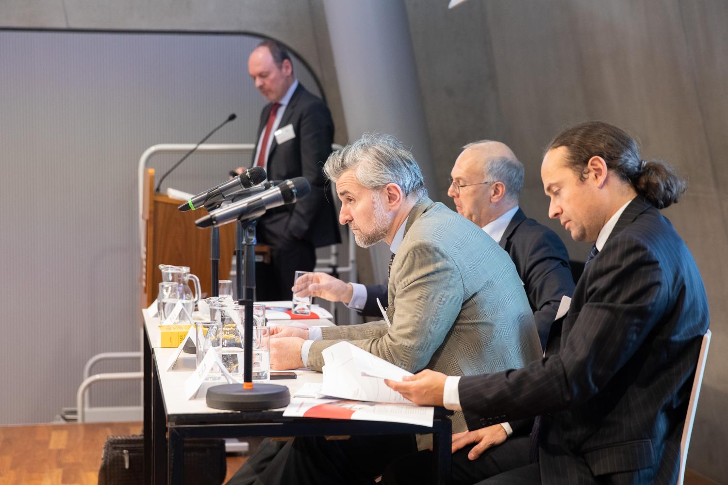 Wie schon letztes Jahr bot die Mittagspause Gelegenheit, den fachlichen Austausch fortzuführen und Kontakte zu pflegen. Die anschließende Nachmittagssession startete mit einer hochkarätig besetzten Podiumsdiskussion unter der Leitung von Rainer Wolfbauer: Die Diskutanten widmeten sich der Proportionalität des Handelns der Bankenaufsicht, wie sie der CRR-Review nun verstärkt vorsieht. Thomas Stern (FMA Liechtenstein), Markus Dellinger (Österreichischer Raiffeisenverband) und Michael Hysek (Bankenaufsicht FMA) gaben in Form von „lightning talks“ Einblicke in den neuen regulatorischen Rahmen des Europäischen Bankensektors und die Maßnahmen zur Verbesserung und Verstärkung der Proportionalität im Aufsichtsrecht. Thomas Stern eröffnete dem Publikum eine wohltuende Vogelperspektive auf den regulatorischen Wildwuchs und skizzierte allgemeine Grundlinien und Trends; bei der im EU-Recht häufig anzutreffenden Verhältnismäßigkeit handle es sich um einen unbestimmten Rechtsbegriff, weil sie in mehreren Dimensionen und Perspektiven auftrete. Die jüngere Finanzmarktregulierung habe sich jedoch darin versucht, Verhältnismäßigkeit näher zu determinieren, indem sie ihren Anwendungsbereich modifiziert und die Normadressaten in Kategorien einteilt. Nach Darstellung der Wesensmerkmale, die Kreditinstitute verschiedener Größen charakterisieren, und der damit verbundenen Rechtsfolgen hakte schließlich Markus Dellinger pointiert und anschaulich in die Thematik ein. Er präsentierte das vereinfachte Aufsichtsregime, das kleine, nicht-komplexe Banken nun anwenden können. Diese Vereinfachungen zeichneten sich etwa dadurch aus, dass sie die Offenlegungsanforderungen reduzieren, die Auszahlung variabler Vergütungen begünstigen, das Meldewesen vereinfachen, dazu berechtigen, eine „vereinfachte“ – allerdings immer noch in 17 (!) Artikeln festgeschriebene – Berechnungsmethode zur Ermittlung der Net Stable Funding Ratio (NSFR) in Anspruch zu nehmen sowie den Schwellenwert für Nichthandelsbuchinstitute erhöhen. Dellinger strich die Besonderheiten des österreichischen Bankensektors hervor: Hierzulande seien etwa 90 % der Kreditinstitute den kleinen, nicht komplexen Instituten zuzuordnen. Diesen Ausführungen schloss sich Michael Hysek mit Ausführungen an, die ganz konkret veranschaulichten, wie Proportionalität in der Aufsichtspraxis effizient und effektiv umsetzbar ist. Hysek gab nicht nur Einblicke in die Rolle Proportionalität in der täglichen Arbeit der FMA; vielmehr blickte er auch in die Zukunft und erläuterte, welche Schritte anstehen, um Proportionalität auf europäischer Ebene umzusetzen. Im Anschluss an die hochkarätigen Impulsreferate des Podiums, entspann sich eine angeregte Diskussion mit dem Publikum.
